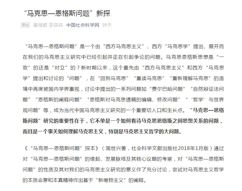 近日,公司BB贝博艾弗森蔺海鲲教授、李菲菲老师发表在中国社会科学报(2020年5月7日)的文章《“马克思—恩格斯问题”新探》在中国社会科学网刊登,该文是对《“马克思—恩格斯问题”探本》(周世兴著,社会科学文献出版社2018年1月版)一书所写的书评,并据此提出当前马克思主义研究中的基本方法和思维路径。