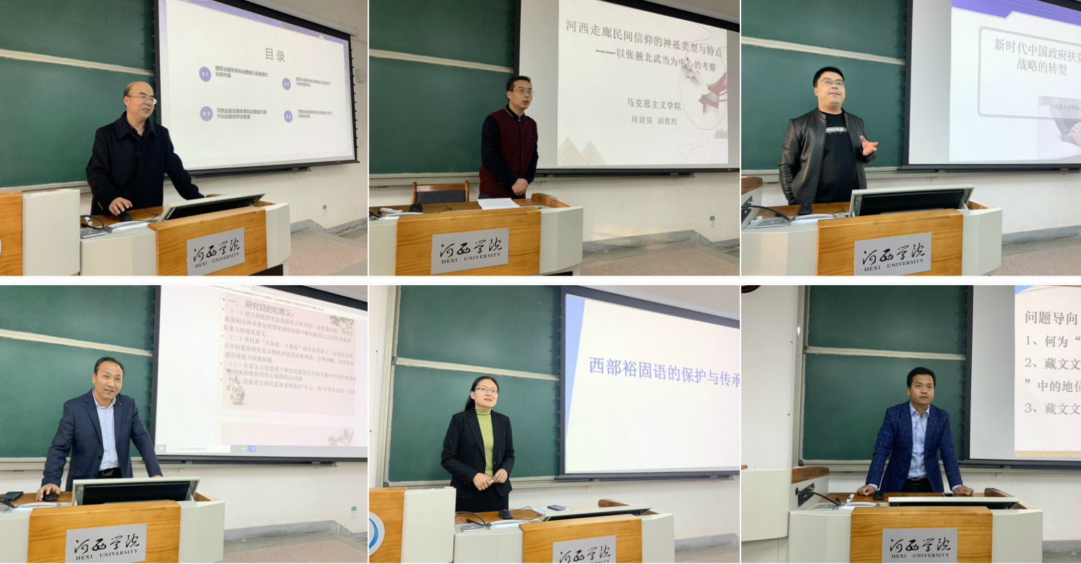 报告会上,宁军、周建强、陶有祥、才昂闹日、郭梅、多杰项智6位老师以个人学术研究专长为出发点,分别作了题为《河西走廊政治治理现代化及其治理机制研究》、《河西走廊民间信仰的神祗类型与特点——以张掖北武当为中心的考察》、《新时代中国政府扶贫战略的转型》、《试论社会语言学视野下的民族交流、交往与交融--以甘肃省夏河县L村为例》、《西部裕固语的保护与传承》和《敦煌藏文文献在敦煌学研究中的地位与价值》的专题报告。报告内容包括国家治理体系、治理能力现代化,脱贫攻坚重大战略,具有浓郁地方特色的民族语言保护传承、文献整理编纂、民族交往交流交融历程等,梳理了本地区在国家大政方针与经济发展、文化繁荣中的重大理论现实问题,为公司师生带来一场思维模式多元化、学科内容丰富化的思想对话,通过常态化的机制搭建了公司师生学习、交流与共享的学术平台。