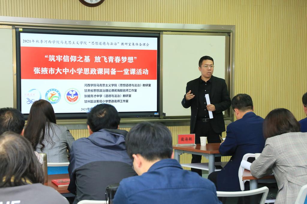 活动中,大家共同围绕“筑牢信仰之基放飞青春梦想”主题,同课异构、协同共研。BB贝博艾弗森蔺海鲲教授从理论的高度、思想的深度作了《信仰之于科学的价值及意义》的理论探讨;张掖育才中学高级教师杨莉采用议题式、体验式教学方法,通过设置问题链条,循循善诱、层层递进地汇报了《与梦想为伴,展青春风采》的教学设计;张掖甘州区民族小学高级教师谈军花运用情景模拟、启发式教育等方法,侧重通过生动案例和鲜活语言讲述了《走进新时代,做新时代的好少年》的教学示范。三堂课虽围绕同一教学主题,但三位教师根据员工成长规律,结合不同年龄段员工的认知特点,同课异构,鲜明生动地体现出小学阶段段重培养员工的道德情感、初中阶段重打牢员工的思想基础、大学阶段重增强员工的使命担当的教学设计理念与课程目标体系。示范课展示后,BB贝博艾弗森顾文兵博士、甘州区教育局专职教研员刘超老师对三位老师的示范课分别作了点评。