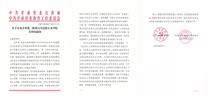 近日,中共甘肃省委宣传部、中共甘肃省委教育工委联合发布《关于公布全省第二批重点BB贝博艾弗森名单的通知》(甘教工委思函[2023]9号),公布了通过评估验收的全省第二批“重点BB贝博艾弗森”名单,BB贝博艾弗森名列其中。